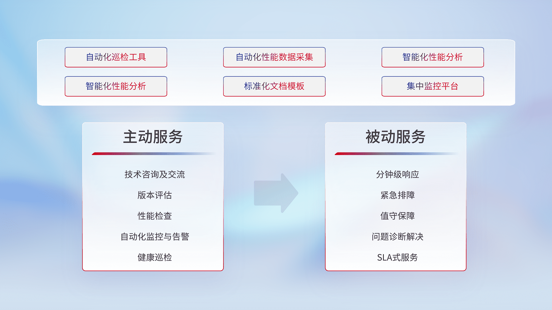 智能化工具和标准化文档,,,保障服务质量,,,提供主动服务(包含技术咨询、、、、版本评估、、、性能检查、、自动化监控与告警、、、健康巡检)和被动服务包含(分钟级响应、、紧急排障、、、值守保障、、、、问题诊断解决、、、SLA服务)。。